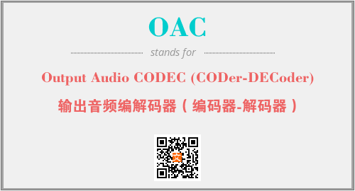 上述内容是“Output Audio CODEC (CODer-DECoder)”作为“OAC”的缩写,解释为“输出音频编解码器(编码器-解码器)”时的信息,以及英文缩略词OAC所代表的英文单词,其对应的中文拼音、详细解释以及在英文中的流行度和相关分类、应用领域及应用示例等。