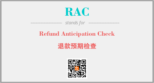 英文缩略词“RAC”经常作为“Refund Anticipation Check”的英文缩写来使用,中文表示:“退款预期检查”。本文将详细介绍英文缩写词RAC所代表英文单词,其对应的中文拼音、详细解释以及在英语中的流行度。此外,还有关于缩略词RAC的分类、应用领域及相关应用示例等。