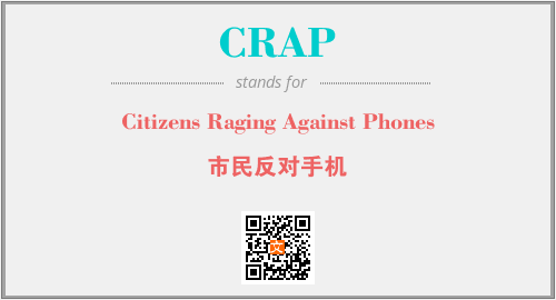 上述内容是“Citizens Raging Against Phones”作为“CRAP”的缩写,解释为“市民反对手机”时的信息,以及英文缩略词CRAP所代表的英文单词,其对应的中文拼音、详细解释以及在英文中的流行度和相关分类、应用领域及应用示例等。