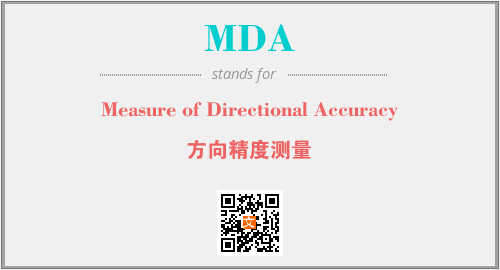上述内容是“Measure of Directional Accuracy”作为“MDA”的缩写,解释为“方向精度测量”时的信息,以及英文缩略词MDA所代表的英文单词,其对应的中文拼音、详细解释以及在英文中的流行度和相关分类、应用领域及应用示例等。