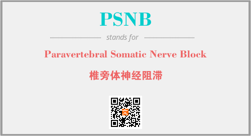 上述内容是“Paravertebral Somatic Nerve Block”作为“PSNB”的缩写,解释为“椎旁体神经阻滞”时的信息,以及英文缩略词PSNB所代表的英文单词,其对应的中文拼音、详细解释以及在英文中的流行度和相关分类、应用领域及应用示例等。