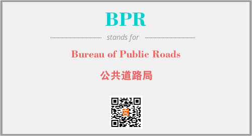 英文缩略词“BPR”经常作为“Bureau of Public Roads”的英文缩写来使用,中文表示:“公共道路局”。本文将详细介绍英文缩写词BPR所代表英文单词,其对应的中文拼音、详细解释以及在英语中的流行度。此外,还有关于缩略词BPR的分类、应用领域及相关应用示例等。