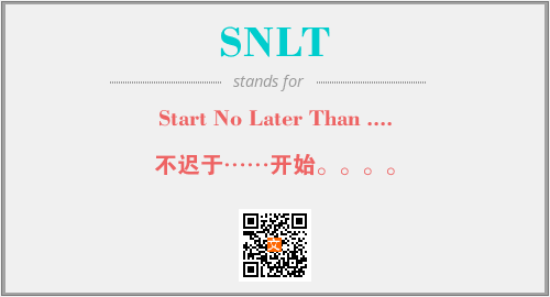 上述内容是“Start No Later Than ....”作为“SNLT”的缩写,解释为“不迟于……开始。。。。”时的信息,以及英文缩略词SNLT所代表的英文单词,其对应的中文拼音、详细解释以及在英文中的流行度和相关分类、应用领域及应用示例等。