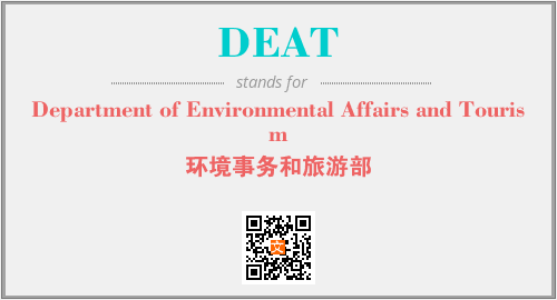 上述内容是“Department of Environmental Affairs and Tourism”作为“DEAT”的缩写,解释为“环境事务和旅游部”时的信息,以及英文缩略词DEAT所代表的英文单词,其对应的中文拼音、详细解释以及在英文中的流行度和相关分类、应用领域及应用示例等。