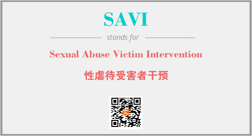 上述内容是“Sexual Abuse Victim Intervention”作为“SAVI”的缩写,解释为“性虐待受害者干预”时的信息,以及英文缩略词SAVI所代表的英文单词,其对应的中文拼音、详细解释以及在英文中的流行度和相关分类、应用领域及应用示例等。