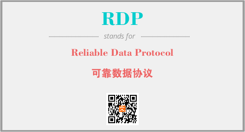 英文缩略词“RDP”经常作为“Reliable Data Protocol”的英文缩写来使用,中文表示:“可靠数据协议”。本文将详细介绍英文缩写词RDP所代表英文单词,其对应的中文拼音、详细解释以及在英语中的流行度。此外,还有关于缩略词RDP的分类、应用领域及相关应用示例等。