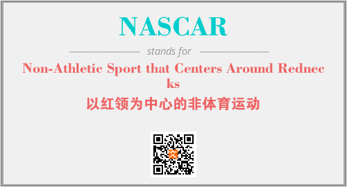 上述内容是“Non-Athletic Sport that Centers Around Rednecks”作为“NASCAR”的缩写,解释为“以红领为中心的非体育运动”时的信息,以及英文缩略词NASCAR所代表的英文单词,其对应的中文拼音、详细解释以及在英文中的流行度和相关分类、应用领域及应用示例等。