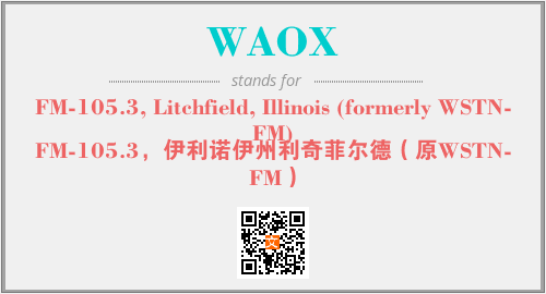 上述内容是“FM-105.3, Litchfield, Illinois (formerly WSTN-FM)”作为“WAOX”的缩写,解释为“FM-105.3,伊利诺伊州利奇菲尔德(原WSTN-FM)”时的信息,以及英文缩略词WAOX所代表的英文单词,其对应的中文拼音、详细解释以及在英文中的流行度和相关分类、应用领域及应用示例等。