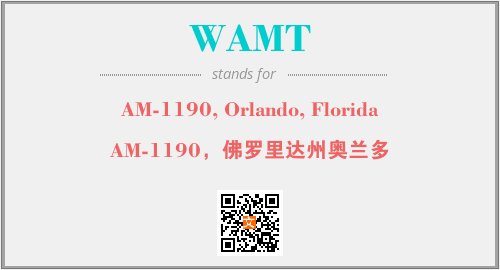 上述内容是“AM-1190, Orlando, Florida”作为“WAMT”的缩写,解释为“AM-1190,佛罗里达州奥兰多”时的信息,以及英文缩略词WAMT所代表的英文单词,其对应的中文拼音、详细解释以及在英文中的流行度和相关分类、应用领域及应用示例等。