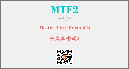 上述内容是“Master Text Format 2”作为“MTF2”的缩写,解释为“主文本格式2”时的信息,以及英文缩略词MTF2所代表的英文单词,其对应的中文拼音、详细解释以及在英文中的流行度和相关分类、应用领域及应用示例等。