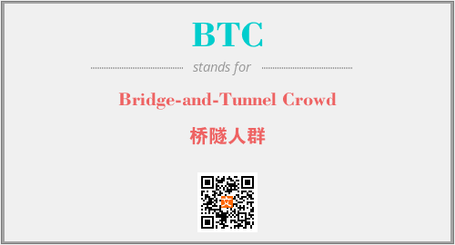 以上为Bridge-and-Tunnel Crowd英文缩略词BTC的中文解释,以及该英文缩写在英语的流行度、分类和应用领域方面的信息。