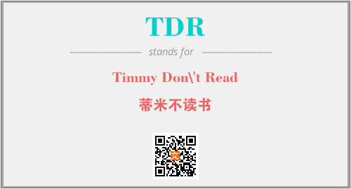 上述内容是“Timmy Don\'t Read”作为“TDR”的缩写,解释为“蒂米不读书”时的信息,以及英文缩略词TDR所代表的英文单词,其对应的中文拼音、详细解释以及在英文中的流行度和相关分类、应用领域及应用示例等。
