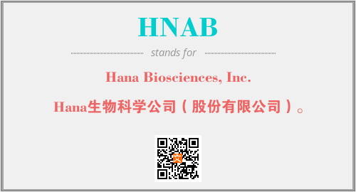 上述内容是“Hana Biosciences, Inc.”作为“HNAB”的缩写,解释为“Hana生物科学公司(股份有限公司)。”时的信息,以及英文缩略词HNAB所代表的英文单词,其对应的中文拼音、详细解释以及在英文中的流行度和相关分类、应用领域及应用示例等。