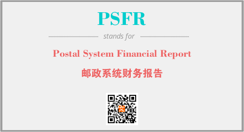 上述内容是“Postal System Financial Report”作为“PSFR”的缩写,解释为“邮政系统财务报告”时的信息,以及英文缩略词PSFR所代表的英文单词,其对应的中文拼音、详细解释以及在英文中的流行度和相关分类、应用领域及应用示例等。