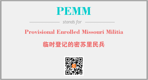 上述内容是“Provisional Enrolled Missouri Militia”作为“PEMM”的缩写,解释为“临时登记的密苏里民兵”时的信息,以及英文缩略词PEMM所代表的英文单词,其对应的中文拼音、详细解释以及在英文中的流行度和相关分类、应用领域及应用示例等。