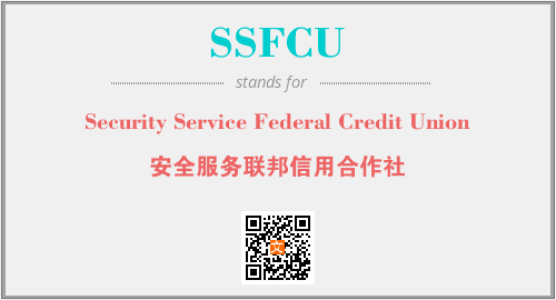 上述内容是“Security Service Federal Credit Union”作为“SSFCU”的缩写,解释为“安全服务联邦信用合作社”时的信息,以及英文缩略词SSFCU所代表的英文单词,其对应的中文拼音、详细解释以及在英文中的流行度和相关分类、应用领域及应用示例等。