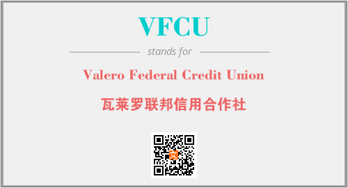 英文缩略词“VFCU”经常作为“Valero Federal Credit Union”的英文缩写来使用,中文表示:“瓦莱罗联邦信用合作社”。本文将详细介绍英文缩写词VFCU所代表英文单词,其对应的中文拼音、详细解释以及在英语中的流行度。此外,还有关于缩略词VFCU的分类、应用领域及相关应用示例等。