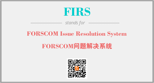 英文缩略词“FIRS”经常作为“FORSCOM Issue Resolution System”的英文缩写来使用,中文表示:“FORSCOM问题解决系统”。本文将详细介绍英文缩写词FIRS所代表英文单词,其对应的中文拼音、详细解释以及在英语中的流行度。此外,还有关于缩略词FIRS的分类、应用领域及相关应用示例等。