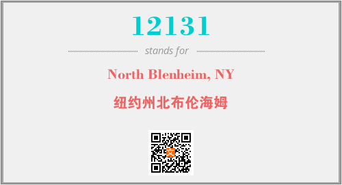上述内容是“North Blenheim, NY”作为“12131”的缩写,解释为“纽约州北布伦海姆”时的信息,以及英文缩略词12131所代表的英文单词,其对应的中文拼音、详细解释以及在英文中的流行度和相关分类、应用领域及应用示例等。