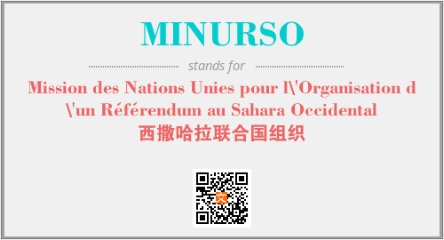 英文缩略词“MINURSO”经常作为“Mission des Nations Unies pour l\'Organisation d\'un Référendum au Sahara Occidental”的英文缩写来使用,中文表示:“西撒哈拉联合国组织”。本文将详细介绍英文缩写词MINURSO所代表英文单词,其对应的中文拼音、详细解释以及在英语中的流行度。此外,还有关于缩略词MINURSO的分类、应用领域及相关应用示例等。