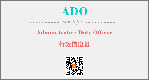 英文缩略词“ADO”经常作为“Administrative Duty Officer”的英文缩写来使用,中文表示:“行政值班员”。本文将详细介绍英文缩写词ADO所代表英文单词,其对应的中文拼音、详细解释以及在英语中的流行度。此外,还有关于缩略词ADO的分类、应用领域及相关应用示例等。