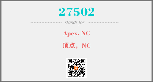 上述内容是“Apex, NC”作为“27502”的缩写,解释为“顶点,NC”时的信息,以及英文缩略词27502所代表的英文单词,其对应的中文拼音、详细解释以及在英文中的流行度和相关分类、应用领域及应用示例等。