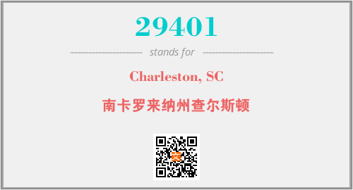 上述内容是“Charleston, SC”作为“29401”的缩写,解释为“南卡罗来纳州查尔斯顿”时的信息,以及英文缩略词29401所代表的英文单词,其对应的中文拼音、详细解释以及在英文中的流行度和相关分类、应用领域及应用示例等。