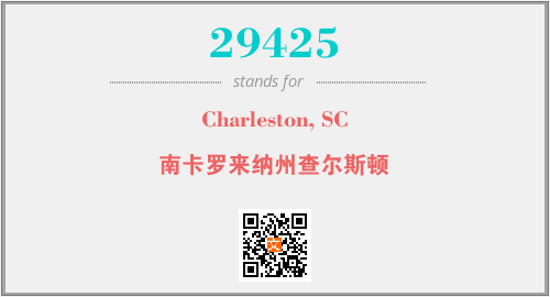 上述内容是“Charleston, SC”作为“29425”的缩写,解释为“南卡罗来纳州查尔斯顿”时的信息,以及英文缩略词29425所代表的英文单词,其对应的中文拼音、详细解释以及在英文中的流行度和相关分类、应用领域及应用示例等。