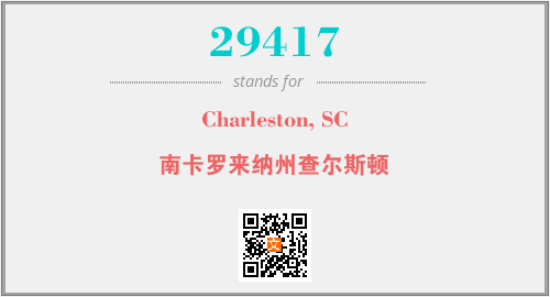 上述内容是“Charleston, SC”作为“29417”的缩写,解释为“南卡罗来纳州查尔斯顿”时的信息,以及英文缩略词29417所代表的英文单词,其对应的中文拼音、详细解释以及在英文中的流行度和相关分类、应用领域及应用示例等。
