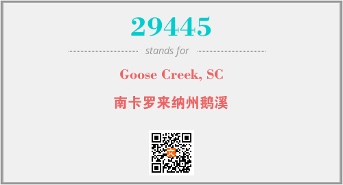 上述内容是“Goose Creek, SC”作为“29445”的缩写,解释为“南卡罗来纳州鹅溪”时的信息,以及英文缩略词29445所代表的英文单词,其对应的中文拼音、详细解释以及在英文中的流行度和相关分类、应用领域及应用示例等。