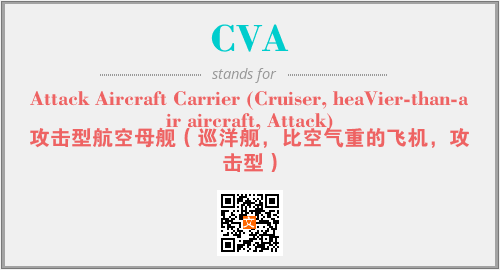 上述内容是“Attack Aircraft Carrier (Cruiser, heaVier-than-air aircraft, Attack)”作为“CVA”的缩写,解释为“攻击型航空母舰(巡洋舰,比空气重的飞机,攻击型)”时的信息,以及英文缩略词CVA所代表的英文单词,其对应的中文拼音、详细解释以及在英文中的流行度和相关分类、应用领域及应用示例等。
