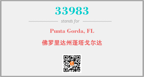 上述内容是“Punta Gorda, FL”作为“33983”的缩写,解释为“佛罗里达州蓬塔戈尔达”时的信息,以及英文缩略词33983所代表的英文单词,其对应的中文拼音、详细解释以及在英文中的流行度和相关分类、应用领域及应用示例等。