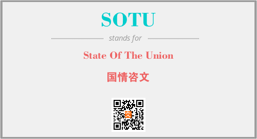 上述内容是“State Of The Union”作为“SOTU”的缩写,解释为“国情咨文”时的信息,以及英文缩略词SOTU所代表的英文单词,其对应的中文拼音、详细解释以及在英文中的流行度和相关分类、应用领域及应用示例等。