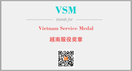 英文缩略词“VSM”经常作为“Vietnam Service Medal”的英文缩写来使用,中文表示:“越南服役奖章”。本文将详细介绍英文缩写词VSM所代表英文单词,其对应的中文拼音、详细解释以及在英语中的流行度。此外,还有关于缩略词VSM的分类、应用领域及相关应用示例等。