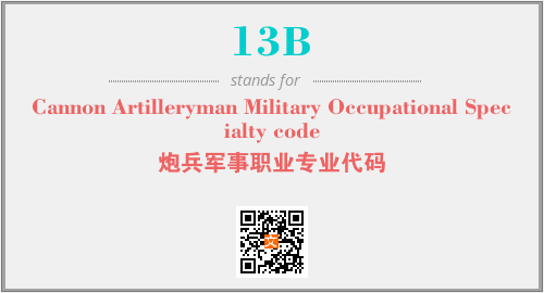 英文缩略词“13B”经常作为“Cannon Artilleryman Military Occupational Specialty code”的英文缩写来使用,中文表示:“炮兵军事职业专业代码”。本文将详细介绍英文缩写词13B所代表英文单词,其对应的中文拼音、详细解释以及在英语中的流行度。此外,还有关于缩略词13B的分类、应用领域及相关应用示例等。
