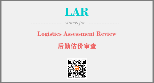 英文缩略词“LAR”经常作为“Logistics Assessment Review”的英文缩写来使用,中文表示:“后勤估价审查”。本文将详细介绍英文缩写词LAR所代表英文单词,其对应的中文拼音、详细解释以及在英语中的流行度。此外,还有关于缩略词LAR的分类、应用领域及相关应用示例等。
