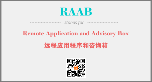 上述内容是“Remote Application and Advisory Box”作为“RAAB”的缩写,解释为“远程应用程序和咨询箱”时的信息,以及英文缩略词RAAB所代表的英文单词,其对应的中文拼音、详细解释以及在英文中的流行度和相关分类、应用领域及应用示例等。