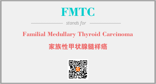 英文缩略词“FMTC”经常作为“Familial Medullary Thyroid Carcinoma”的英文缩写来使用,中文表示:“家族性甲状腺髓样癌”。本文将详细介绍英文缩写词FMTC所代表英文单词,其对应的中文拼音、详细解释以及在英语中的流行度。此外,还有关于缩略词FMTC的分类、应用领域及相关应用示例等。