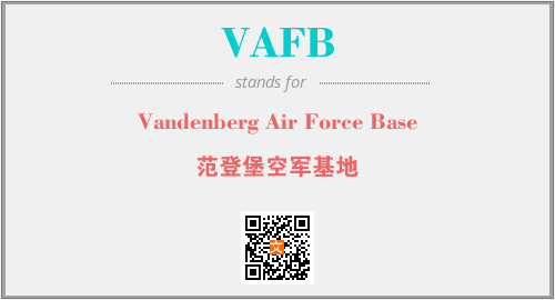 英文缩略词“VAFB”经常作为“Vandenberg Air Force Base”的英文缩写来使用,中文表示:“范登堡空军基地”。本文将详细介绍英文缩写词VAFB所代表英文单词,其对应的中文拼音、详细解释以及在英语中的流行度。此外,还有关于缩略词VAFB的分类、应用领域及相关应用示例等。