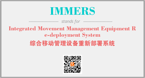 上述内容是“Integrated Movement Management Equipment Re-deployment System”作为“IMMERS”的缩写,解释为“综合移动管理设备重新部署系统”时的信息,以及英文缩略词IMMERS所代表的英文单词,其对应的中文拼音、详细解释以及在英文中的流行度和相关分类、应用领域及应用示例等。