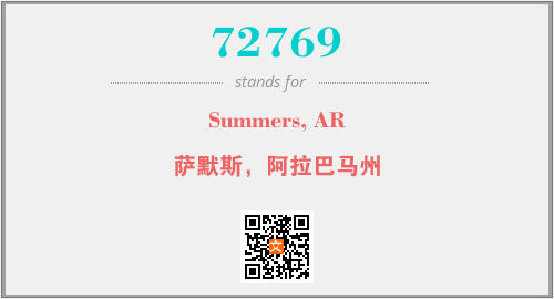 上述内容是“Summers, AR”作为“72769”的缩写,解释为“萨默斯,阿拉巴马州”时的信息,以及英文缩略词72769所代表的英文单词,其对应的中文拼音、详细解释以及在英文中的流行度和相关分类、应用领域及应用示例等。