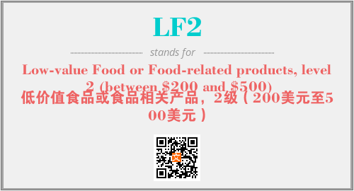 上述内容是“Low-value Food or Food-related products, level 2 (between $200 and $500)”作为“LF2”的缩写,解释为“低价值食品或食品相关产品,2级(200美元至500美元)”时的信息,以及英文缩略词LF2所代表的英文单词,其对应的中文拼音、详细解释以及在英文中的流行度和相关分类、应用领域及应用示例等。