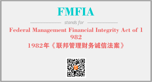 上述内容是“Federal Management Financial Integrity Act of 1982”作为“FMFIA”的缩写,解释为“1982年《联邦管理财务诚信法案》”时的信息,以及英文缩略词FMFIA所代表的英文单词,其对应的中文拼音、详细解释以及在英文中的流行度和相关分类、应用领域及应用示例等。