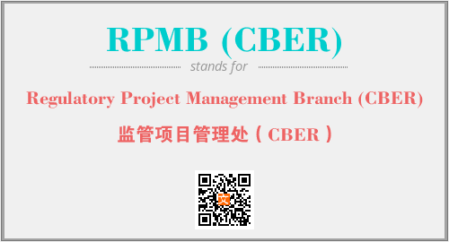 上述内容是“Regulatory Project Management Branch (CBER)”作为“RPMB (CBER)”的缩写,解释为“监管项目管理处(CBER)”时的信息,以及英文缩略词RPMB (CBER)所代表的英文单词,其对应的中文拼音、详细解释以及在英文中的流行度和相关分类、应用领域及应用示例等。
