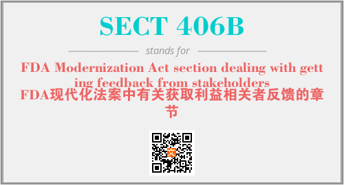 上述内容是“FDA Modernization Act section dealing with getting feedback from stakeholders”作为“SECT 406B”的缩写,解释为“FDA现代化法案中有关获取利益相关者反馈的章节”时的信息,以及英文缩略词SECT 406B所代表的英文单词,其对应的中文拼音、详细解释以及在英文中的流行度和相关分类、应用领域及应用示例等。