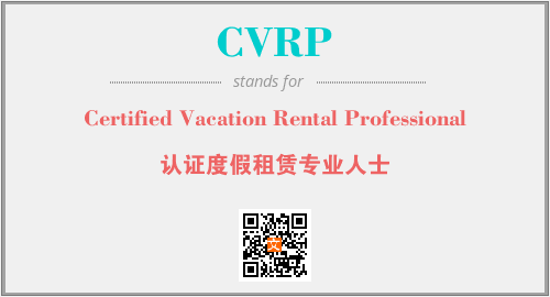 英文缩略词“CVRP”经常作为“Certified Vacation Rental Professional”的英文缩写来使用,中文表示:“认证度假租赁专业人士”。本文将详细介绍英文缩写词CVRP所代表英文单词,其对应的中文拼音、详细解释以及在英语中的流行度。此外,还有关于缩略词CVRP的分类、应用领域及相关应用示例等。