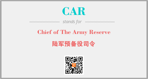 上述内容是“Chief of The Army Reserve”作为“CAR”的缩写,解释为“陆军预备役司令”时的信息,以及英文缩略词CAR所代表的英文单词,其对应的中文拼音、详细解释以及在英文中的流行度和相关分类、应用领域及应用示例等。
