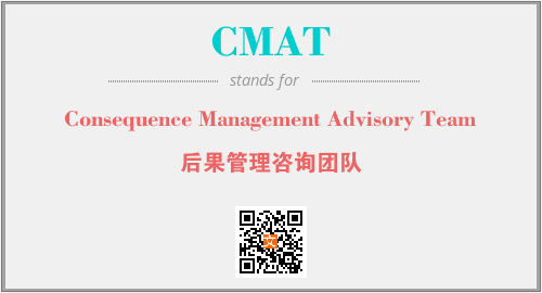 上述内容是“Consequence Management Advisory Team”作为“CMAT”的缩写,解释为“后果管理咨询团队”时的信息,以及英文缩略词CMAT所代表的英文单词,其对应的中文拼音、详细解释以及在英文中的流行度和相关分类、应用领域及应用示例等。