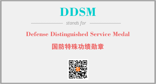 上述内容是“Defense Distinguished Service Medal”作为“DDSM”的缩写,解释为“国防特殊功绩勋章”时的信息,以及英文缩略词DDSM所代表的英文单词,其对应的中文拼音、详细解释以及在英文中的流行度和相关分类、应用领域及应用示例等。