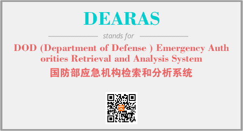 上述内容是“DOD (Department of Defense ) Emergency Authorities Retrieval and Analysis System”作为“DEARAS”的缩写,解释为“国防部应急机构检索和分析系统”时的信息,以及英文缩略词DEARAS所代表的英文单词,其对应的中文拼音、详细解释以及在英文中的流行度和相关分类、应用领域及应用示例等。